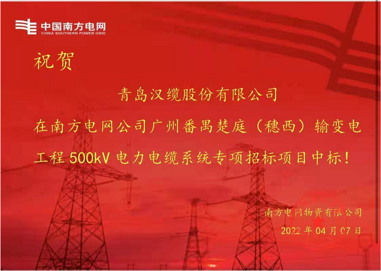 4月7日,青島漢纜股份有限公司接到南方電網(wǎng)物資有限公司的中標(biāo)通知,公司贏得中國南方電網(wǎng)公司首個(gè)500kV電纜系統(tǒng)重大合同:廣州楚庭(穗西)輸變電工程提供500kV超高壓交流電力電纜及附件。該合同進(jìn)一步深化了南方電網(wǎng)與漢纜股份的合作,為南方電網(wǎng)公司提供世界一流的電力保障,助力粵港澳大灣區(qū)的社會(huì)經(jīng)濟(jì)發(fā)展。項(xiàng)目將全線在電力電纜隧道中安裝總長約67km的青島漢纜供貨的500kV,2500mm2超高壓交流電力電纜和電纜附件,中標(biāo)金額約2.6億元。